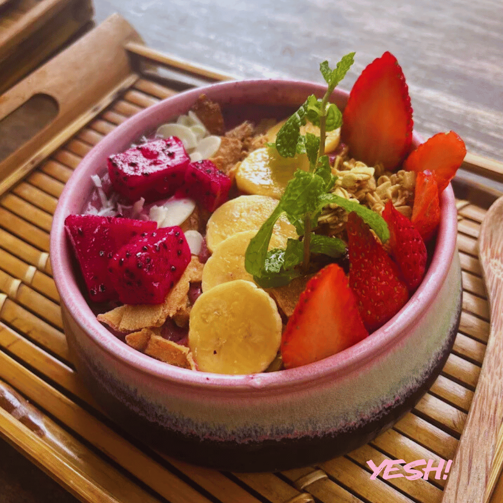 blueberries, raspberries, strawberries, banana, homemade granola, nuts & fruits