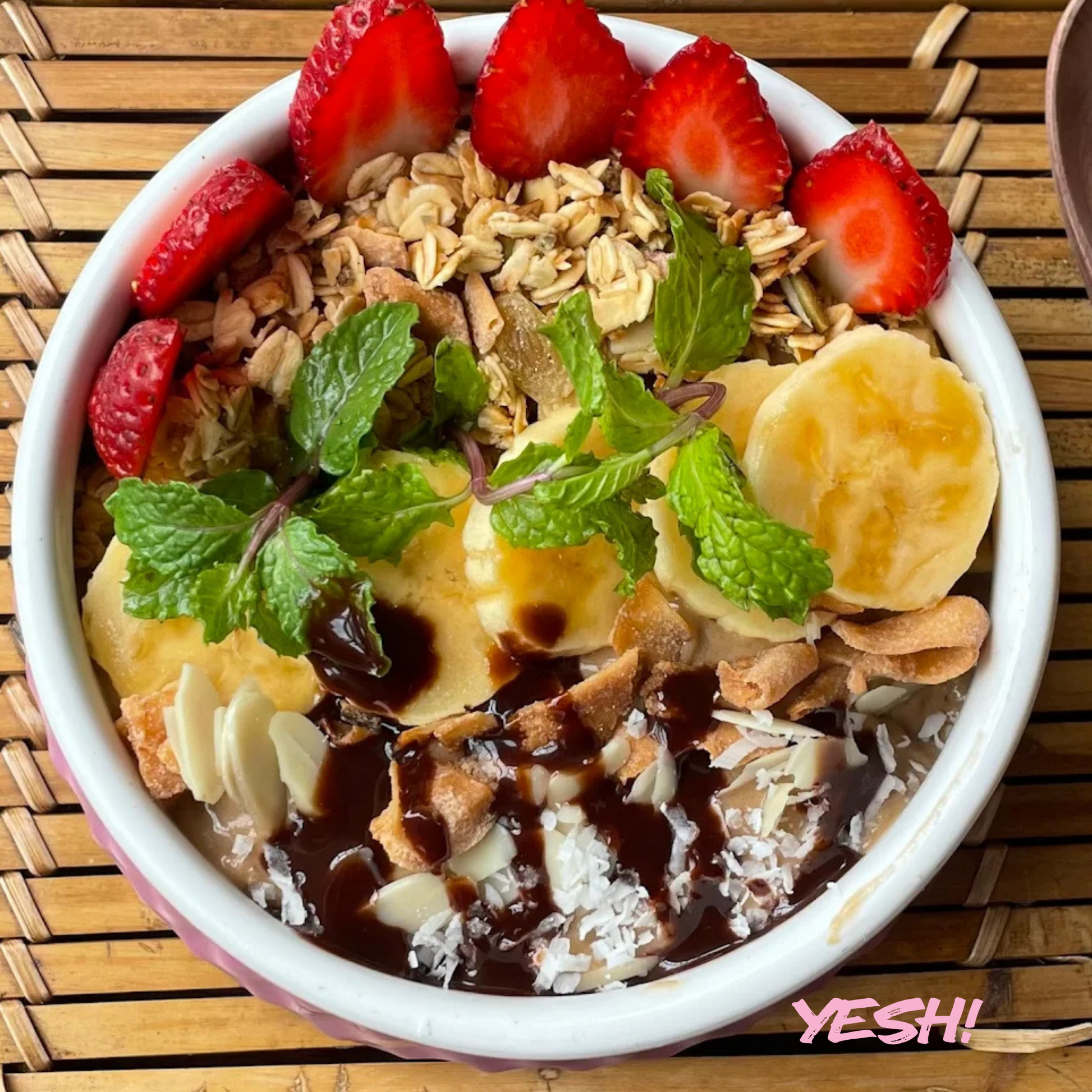 peanut butter, almond milk, banana, homemade granola, nuts & fruits